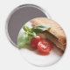 Imã fotográfico redondo com uma comida italiana saudável, constituída por uma sanduíche de panini e um tomate, folhas de manjericão verde e queijo mozzarella em fundo branco.