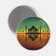 Eid Mubarak saudando a ilustração: uma mesquita e uma silhueta de palmas em um fundo noturno com a lua e estrelas refletindo sobre a água.