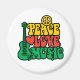 Digite design de PEACE, LOVE & MUSIC com guitarra, Símbolo de Paz, Notas de Coração e Música em amarelo, vermelho e verde.