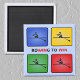 Este ímã representa quatro ícones coloridos (vermelho, amarelo, verde, azul) com um remador na silhueta. A legenda é "ROwing to WIN", e o WIN é escolhido duas vezes em vermelho.