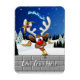 Um divertido rena de desenho animado com um nariz vermelho brilhante e grandes chifres brancos, adornado com um laço vermelho e dourado, espreita por uma janela aberta. Do lado de fora, uma paisagem nevada com silhuetas de pinheiros e uma pequena casa iluminada é visível sob um céu noturno azul escuro cheio de estrelas. O trenó do Papai Noel puxado por renas está voando ao longe. A cena evoca uma atmosfera festiva e caprichosa de Natal. Arte Vetorial Original Copyright BluedarkArt TheChameleonArt.