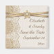 Lace branca elegante, fita e flor em burlap no Save the Date de casamento, apresentando lace branca em burlap natural de linho ou hessian com duas fitas de cetim cruzadas e flor bege com brilho metálico e uma joia branca. Texto em marrom. Observe que a lace, o burlap, a flor e a joia são todos "impressos" e não tecido real, gema ou cristal. Este design elegante, sofisticado e romântico com uma essência rústica faz parte de um conjunto de casamento e é perfeito para um casamento country chic ou western na primavera, verão ou outono com uma paleta de cores neutras.