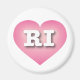 Este ímã apresenta um coração cor-de-rosa com um centro lavado em branco contendo as letras maiúsculas, brancas, em negrito, RI, a abreviação oficial de Rhode Island, o estado do oceano.