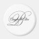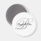 Ímanes de casamento com um monograma minimalista de casal em um roteiro de caligrafia em rico e preto sobre fundo branco. Para nomes mais curtos, aumente o tamanho da fonte dos nomes da noiva e do noivo e seus nomes iniciais. Personalize as cores das cinzas pretas e prateadas, bem como os estilos modernos de fontes da caligrafia.