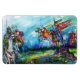Cavalos medievais com cavalos, pintura figurativa colorida e expressiva contemporânea em azul vibrante, vermelho, verde branco, castanho, aquarela de Alessandro Lumini 1989 inspirada na lenda do Rei Arthur e nas Cavalarias da Mesa redonda. Este design legal e artístico também é um belo presente para o Natal e ocasiões especiais.