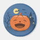 Adorável riso de abóbora de Halloween. Uma árvore morto, uma mansão assustadora, alguns morcegos, e a lua são vistos no fundo.