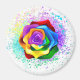 Rosa grande e florescente com pétalas arco-íris sobre fundo branco, pintadas com pedaços de tinta colorida e brilhante. 3d