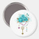 Chave de ouro antiga com rosas de turquesa de tendência, decoradas com folhas de ouro branco e miçangas cor-de-rosa e azuis. Cor agradável. Rosas de turquesa. Ouro branco. Tifania azul.