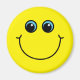 Este ímã apresenta uma face amarela sorridente de emoji com olhos azuis.