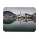 Imagem fotográfica retangular com uma cena de inverno com reflexo da torre amarela da igreja na água do lago de Tegernsee e com neve nos telhados das casas da cidade de Rottach-Egern com as montanhas dos Alpes no fundo da Baviera (Bayern), Alemanha.