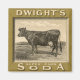 Arte de rótulo de produto de ilustração vintage anúncio apresentando refrigerante super bicarbonatado da marca Dwight. O texto diz; primeiro, mais barato, melhor, John Dwight & Company, Nova York. Publicidade antiga apresentando uma vaca em pé em um campo de fazenda.