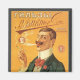 Arte de rótulo de produto de ilustração antiga, anúncio com um homem vestido com um terno elegante fumando um cigarro. Ele está desfrutando de um cigarro com caixas de tabaco à sua frente. Publicidade antiga com o texto Mockba (Moscou).
