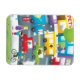 Artista: Marcus Cutler | ilustração de uma zona de ocupação urbana e ponto de ônibus com peões e carros, caminhões e compras e um rapaz de bicicleta