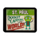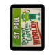 Uma Rua encantadora. Um ímã de geladeira de viagens vintage Paul Minnesota com um robô engraçado e amigável, junto com um texto divertido no estilo retrô que diz, "Vejo você na Rua Paul."
