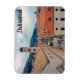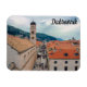 Pintura do centro da cidade de Dubrovnik, antiga torre e multidão. Rua turística estreita em massa na cidade antiga, Vista de telhados vermelhos e torre.