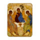 Antiquado Andrei Rublev trabalho de arte/ícone representando o Pai, o Filho e o Espírito Santo sentados numa mesa. As imagens parecem ter asas de anjo.