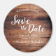 Personalize este casamento exclusivo Salve os ímãs do círculo de Datas. Ele mostra lascas de madeira escura impressas em forma redonda, perfeito para seu casamento rústico e romântico. Personalize os nomes da noiva e do noivo, a data do casamento e a localização.