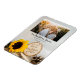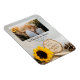 Personalize o casamento natural de Sunflower Woods Salve o Magnet Flexível de Data com os nomes pessoais da noiva e do noivo e a data da cerimônia de casamento de madeira. Essa terra de madeira ou nupcial florestal personalizada, quic-chic do país, mantém a data do ímã dobrável uma fotografia típica de uma flor de girassol amarela, fatias de madeira com as palavras SAVE THE DATE queimadas nela, cones de pinheiro castanho e véu branco com uma burapa e fundo branco de cebola.