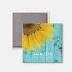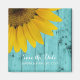 Faça o seu girassol rústico salvar os ímãs estilo país- Mantenha-se personalizado para enviar convidados de casamento e membros da família para anunciar o seu noivado - pranchas de madeira de ameixa rústica, turquesa ou sangrando, como fundo de madeira de praia aqua com girassol amarelo e jumbo no canto superior. Lê 'Salvar a Data' em um guião elegante. Nomes do casal e da data do casamento no fundo, na fonte moderna. Bonito guardião favoritos para se lembrar do seu dia especial. Combina com temas de casamento florais de girassol, casamentos de madeiras rústicas, cores de casamento amarelas e turquesas, estilos de casamento de campo, casamentos de outono ou verão, decoração de casamento de praia e casamentos de chic country.