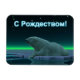 Um momento pacífico na longa noite árctica. Um Urso Polar repousa na borda de uma área aberta no gelo da matilha. As luzes do Norte brilham à distância; as estrelas brilhantes brilham sobre a cabeça. O texto cirílico que lê "S Rozhdestvom" (С Р ж д е т с в о мо - Uma saudação de Natal russa) aparece em azul e branco brilhantes. Adicione seu próprio texto no verso. Os ursos polares estão ameaçados. Quanto tempo mais cenas como esta poderão ocorrer? Por favor, ajude a salvar os Ursos Polares da extinção.