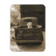 Saia do Dodge de Jim Dratfield. Esta fotografia sépia é de um cão fofo sentado alegremente na parte de trás de um caminhão.