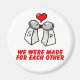 Um belo par de saleiros e pimentões beijando com um coração acima deles e a legenda "Fomos feitos um para o outro"