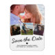 Ímã elegante de salvar a data do casamento com fundo branco que pode ser alterado para qualquer cor, 4 fotos do casal feliz e um modelo moderno de salvar a data que é fácil de personalizar.