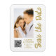 Salve a data White Dourada Na moda com Script Modern Wedding Magnets apresenta um fundo branco com sua foto personalizada. Personalize com seu texto editando o texto nas caixas de texto fornecidas e adicione o URL do seu site para o seu código QR personalizado. Projetado para você por ©Evco Studio www.zazzle.com/store/evcostudio