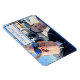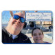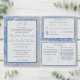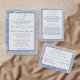 Design apresenta a sua fotografia como imagem principal. Fitas caindo como em fotos de sobreposição de celebrações. O canto superior direito exibe uma caixa de cinza em azul com suas informações. Exemplo de texto diz: "Salve a data!" Os nomes dos casais, a data, a cidade e o estado aparecem logo abaixo. Todo texto é personalizável. Projetado para coordenar com a suíte de casamento "Blue and Cinza Marbled".