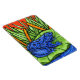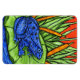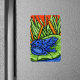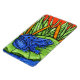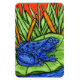 Imagem é minha pintura acrílica original. Este vibrante sapo venenoso azul com manchas pretas está sentado sobre um lírio verde brilhante na água com grama verde e sementes amarelas atrás dele. O céu de fundo é laranja vibrante. Veja minha loja Art by MAR para combinar produtos com este design.