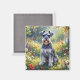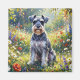 A charming schnauzer sits peacefully in a sunlit meadow filled with vibrant wildflowers.