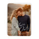 Este elegante casamento salva a data do anúncio apresenta um roteiro de caligrafia gracioso em branco sobre uma foto vertical de sangria de cheio. É o perfeito para salvar o anúncio de data para qualquer casal que busque um design casual, mas elegante.