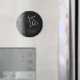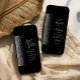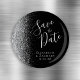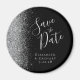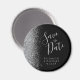 A borda esquerda desta Imã salve a data elegante apresenta uma borda cintilante de falso prateado. O texto personalizável combina o script de escrita manual da cinza prateada com a fonte serif em um plano de fundo preto.