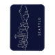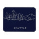 Esta design apresenta um esboço desenhado manualmente do horizonte de Seattle sobre um fundo azul escuro.