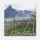 Fotografia que representa a secagem do peixe no ar fresco das ilhas Lofoten na Noruega. Nas montanhas névoas que protegem o porto próximo.