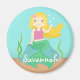Adicione um toque de fantasia e conto de fadas ao seu pequeno mundo com esta doce sereia do oceano. A sereia está sentada em uma pedra acenando para você. Seu cabelo louro está balançando junto com as correntes de água e ela tem um peixe-estrela preso ao seu cabelo como acessório. Uma design colorida e atraente para meninas que amam fantasia, mística, conto de fadas, debaixo do mar, temas submarinos. Personalize facilmente com o nome da criança para lhe dar um presente único.