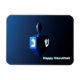 Um sonho modernista, azul metálico contra um fundo escuro e noturno. Duas das letras hebraicas encontradas num sonho, freira e brilho, brilham intensamente. O texto "Happy Hanukkah" também aparece em azul e branco brilhantes.