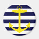 Uma silhueta amarela brilhante de uma âncora está sobre um fundo listrado branco e azul-marinho. Uma design náutica divertida.