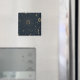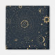 O belo impressão celeste apresenta sóis, luas, estrelas e rodas zodíacas em tons de ouro pálido sobre fundo azul-da-noite.