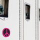 Um símbolo de paz cor-de-rosa rosa contra um fundo preto.