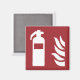 Extintor de incêndio e ícone de chama sobre fundo vermelho.