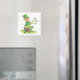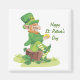Um imã irlandês divertido mostra um Leprechaun sentado em um toco com Shamrocks aos seus pés. Ele está vestido de verde e está segurando um punhado de moedas de ouro.