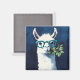Playful twist to cute animal art and humor with a quirky white llama rocking teal glasses and holding a leafy branch.