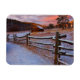 Esta foto mostra um celeiro rústico coberto de neve em frente a um lindo pôr do sol em um rancho no Colorado.