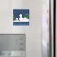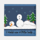 Um imã bonitinho. Pequeno boneco de neve que precisa de ajuda! Árvores e fundo de neve.