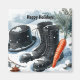 Este ímã de feriado sinaliza a evidência de um boneco de neve. Talvez tenha sido apanhado numa tempestade de neve ou a caminho de uma festa de inverno. Este design apresenta seu chapéu de cima, botas e nariz de cenoura. Um pouco de humor para o feriado.