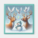 Vestindo um Turquesa Toboggan e Scarf, um Carrot Nosed Snowman está no meio de Dois Veados Machos a olhar para uma Neve Profunda, com bolhas transparentes flutuantes multicoloridas à medida que três pombos de Tartaruga Branca voam acima. Tudo em um fundo azul de neve.