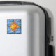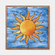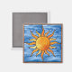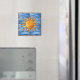 Lindo sol de vidro colorido criado digitalmente em laranjas quentes e ouro contra um céu azul. Adicione um toque de beleza à sua geladeira.