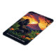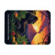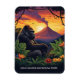 Um pôr do sol vibrante sobre um vulcão no Parque Nacional dos Vulcões, com um gorila em primeiro plano e uma folhagem tropical exuberante.