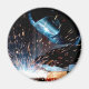 Esta é uma fotografia de um soldador cercado por faíscas.
